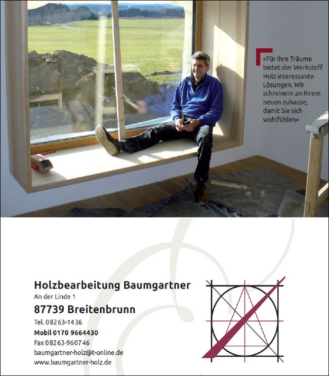 Holzbearbeitung Baumgartner Ust ID DE 164 505 863 Thomas Baumgartner -Schreinermeister- An der Linde 1 87739 Breitenbrunn
